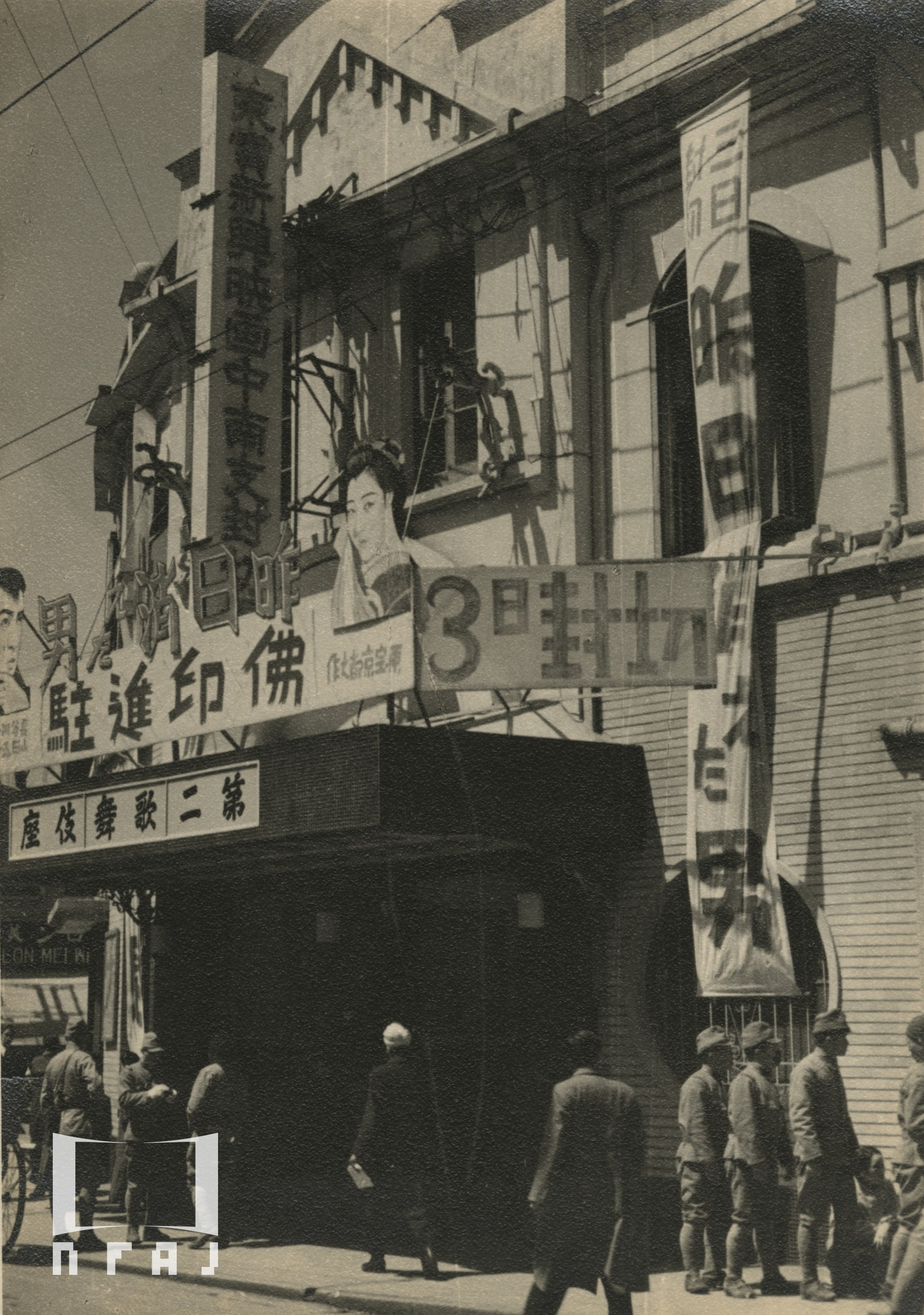 看板に見える上映作品は『夜半歌声 続集』(『続・深夜の歌声』、1941年、中国映画、監督:馬徐維邦、主演:談瑛、劉瓊)。