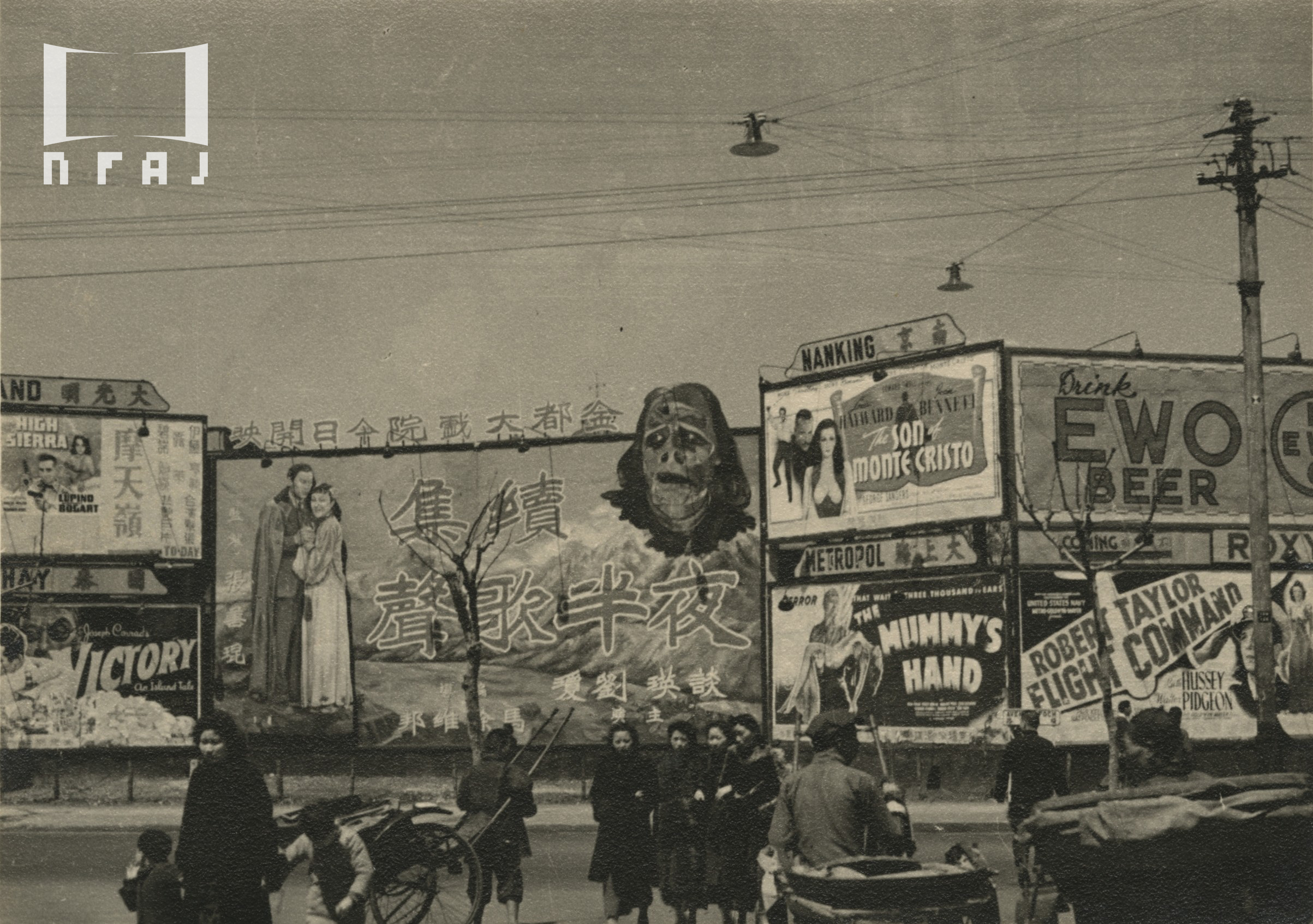 フランス租界のアヴニュー・フォッシュ(Avenue Foch)にあった映画館看板群。中央が金都大戯場の『夜半歌声 続集』、その左隣り上が大光明大戯場の『ハイ・シェラ』High Sierra (1941年、アメリカ映画、当時は日本未公開、中国語題名:摩天嶺、監督:ラオール・ウォルシュ、主演:ハンフリー・ボガート、アイダ・ルピノ)、その下が国泰大戯場の『Victory』(1940年、アメリカ映画、日本未公開、監督:ジョン・クロムウェル、主演:フレデリック・マーチ)、中央の右隣り上が『The Son of Monte Cristo』(1940年、アメリカ映画、日本未公開、監督:ローランド・V・リー、主演:ルイス・ヘイワード、ジョーン・ベネット)、その下が大上海大戯院の『The Mummy’s Hand』(1940年、アメリカ映画、日本未公開、監督:クリスティ・キャバンヌ、主演:ディック・フォーラン)、その横が大華大戯院の『大編隊』Flight Command(1940年、アメリカ映画、当時は日本未公開、監督:フランク・ボーゼイギ、主演:ロバート・テイラー)。
