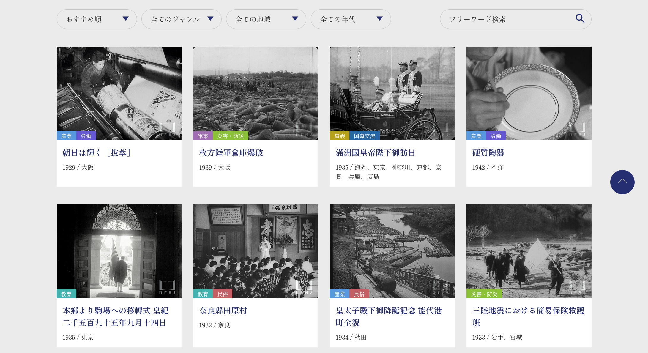第7弾では、1927年から1944年までの間に撮影・製作された30作品を公開しました。満洲帝国にかかわる歴史的場面、昭和三陸地震と日中戦争のさなかに発生した陸軍倉庫の爆発という災害の記録、それに硬質陶磁器製造をはじめ、新聞製作、製鉄、捕鯨などの各種産業の姿を伝えるフィルムに加え、戦時中の動員労働者向けと考えられる教材映画など、激動の時代を映し出す多様な作品を通じて歴史映像の持つ多彩さと魅力を感じていただけるでしょう。(2025.12.26公開)